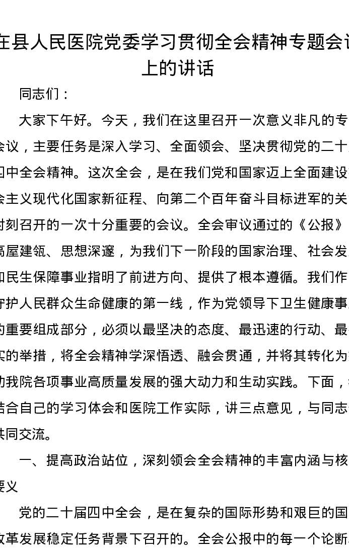 在县人民医院党委学习贯彻二十届四中全会精神专题会议上的讲话