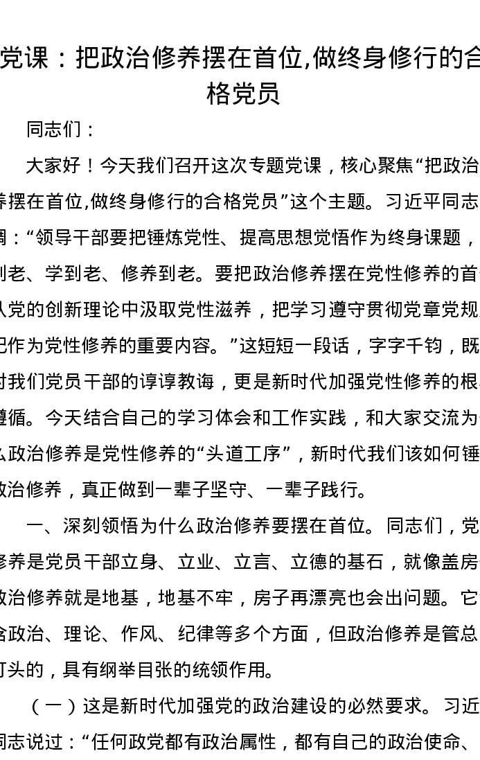 党课讲稿:把政治修养摆在首位,做终身修行的合格党员