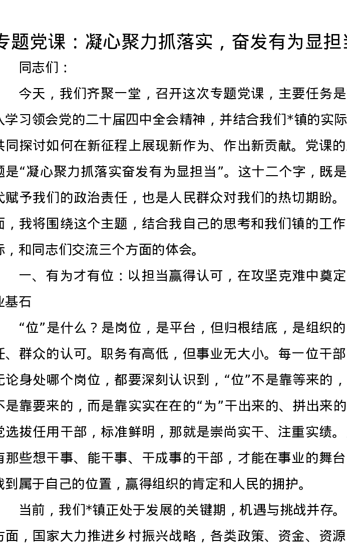 专题党课讲稿:凝心聚力抓落实,奋发有为显担当