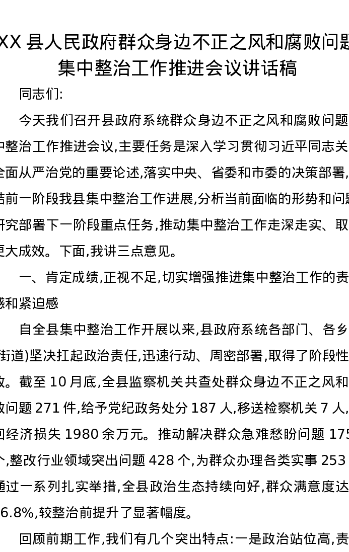 XX县人民政府群众身边不正之风和腐败问题集中整治工作推进会议讲话稿