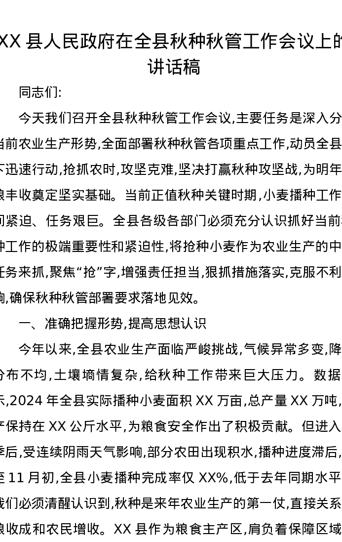 XX县人民政府在全县秋种秋管工作会议上的讲话稿