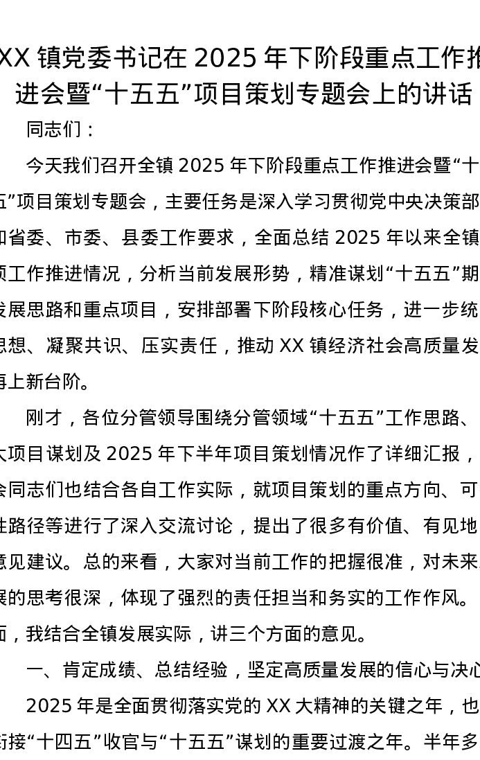 XX镇党委书记在2025年下阶段重点工作推进会暨“十五五”项目策划专题会上的讲话