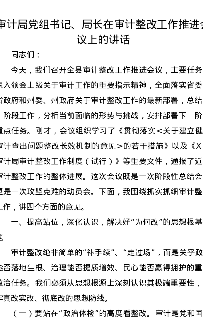 审计局党组书记、局长在审计整改工作推进会议上的讲话