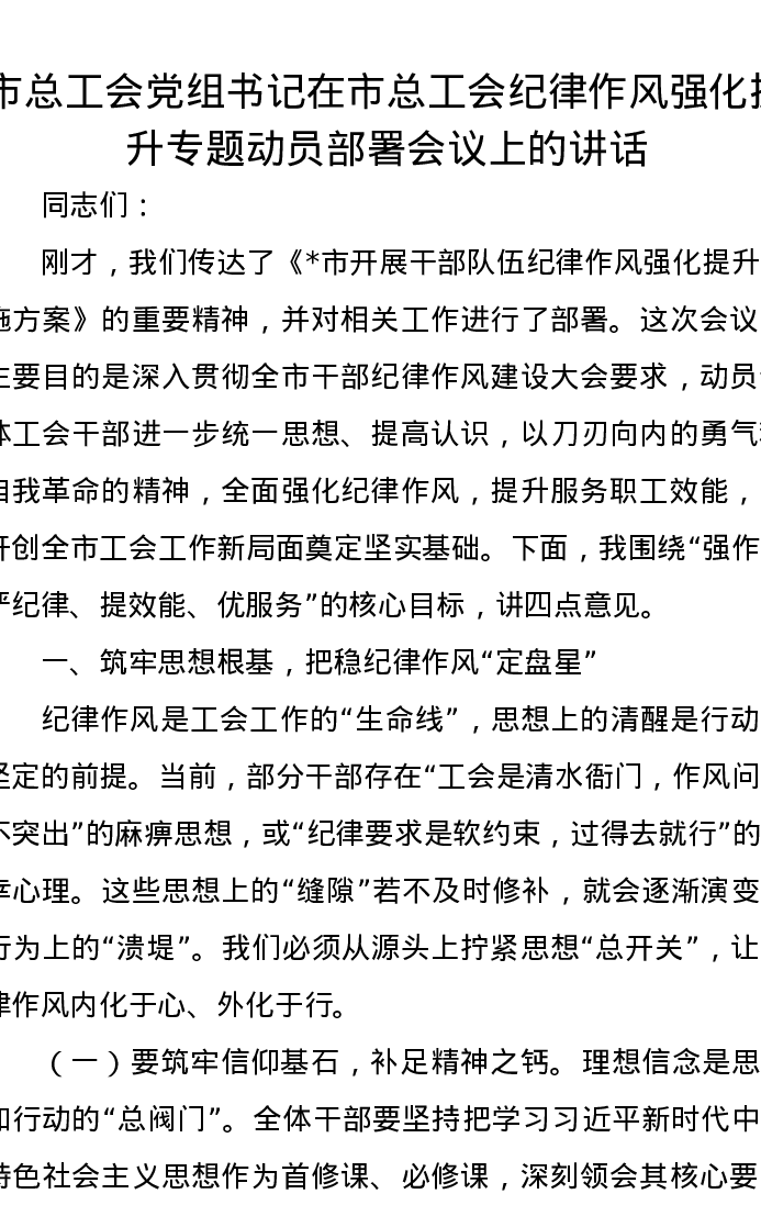 市总工会党组书记在市总工会纪律作风强化提升专题动员部署会议上的讲话