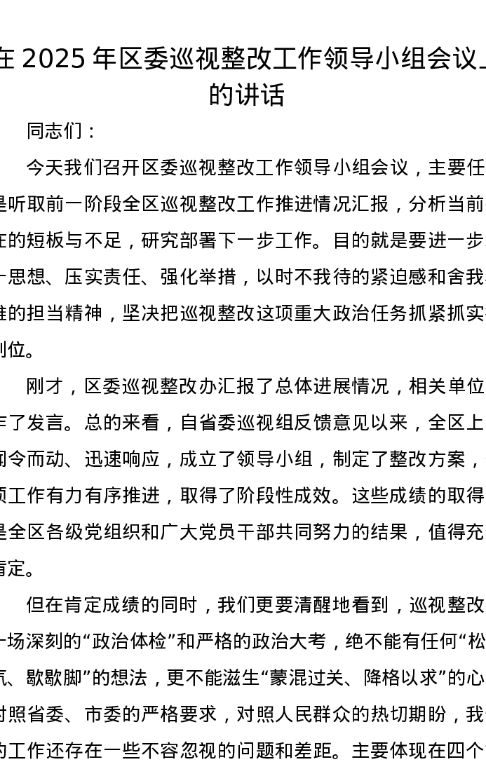 在2025年区委巡视整改工作领导小组会议上的讲话