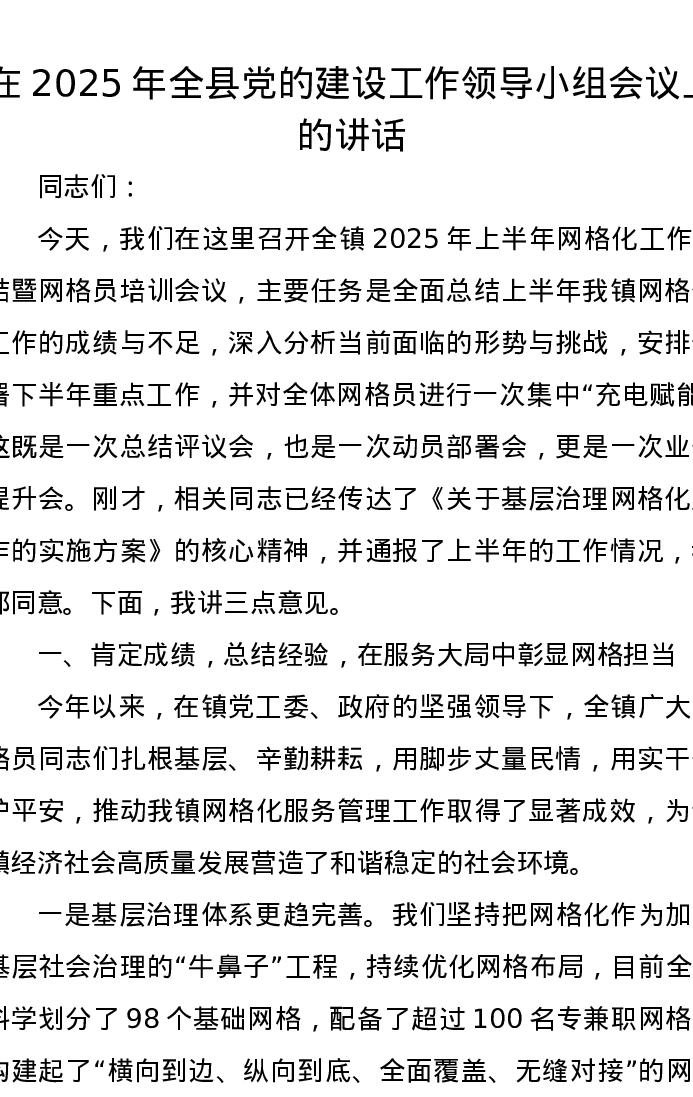 在2025年全县党的建设工作领导小组会议上的讲话