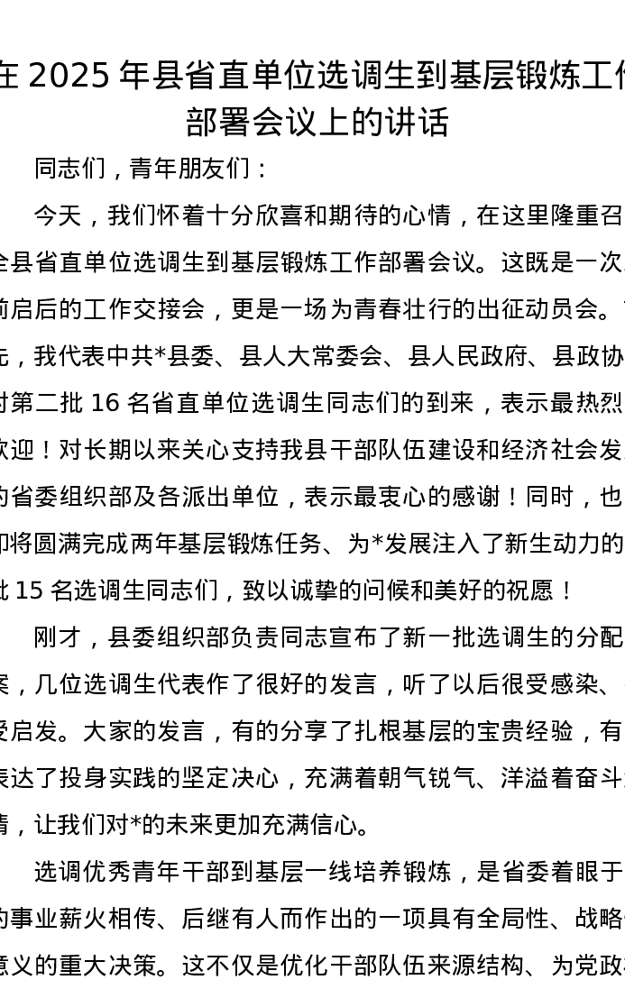 在2025年县省直单位选调生到基层锻炼工作部署会议上的讲话