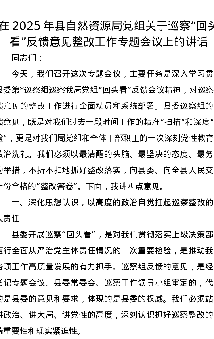 在2025年县自然资源局党组关于巡察“回头看”反馈意见整改工作专题会议上的讲话