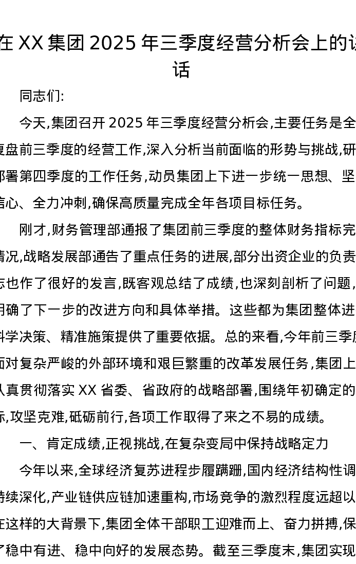 在XX集团2025年三季度经营分析会上的讲话
