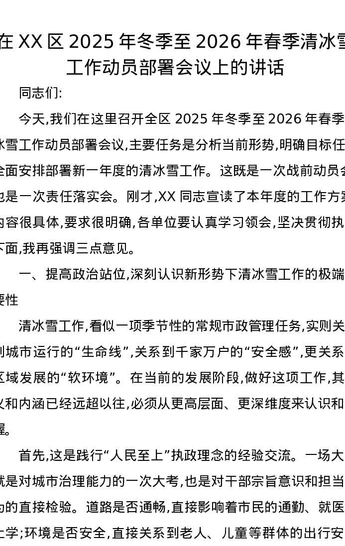 在XX区2025年冬季至2026年春季清冰雪工作动员部署会议上的讲话