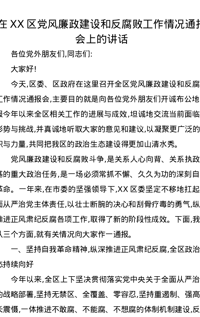 在XX区党风廉政建设和反腐败工作情况通报会上的讲话