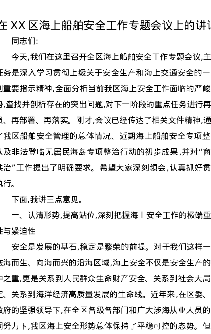 在XX区海上船舶安全工作专题会议上的讲话