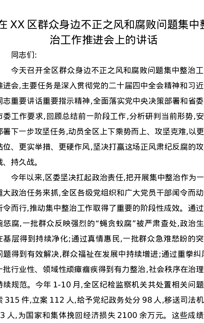 在XX区群众身边不正之风和腐败问题集中整治工作推进会上的讲话