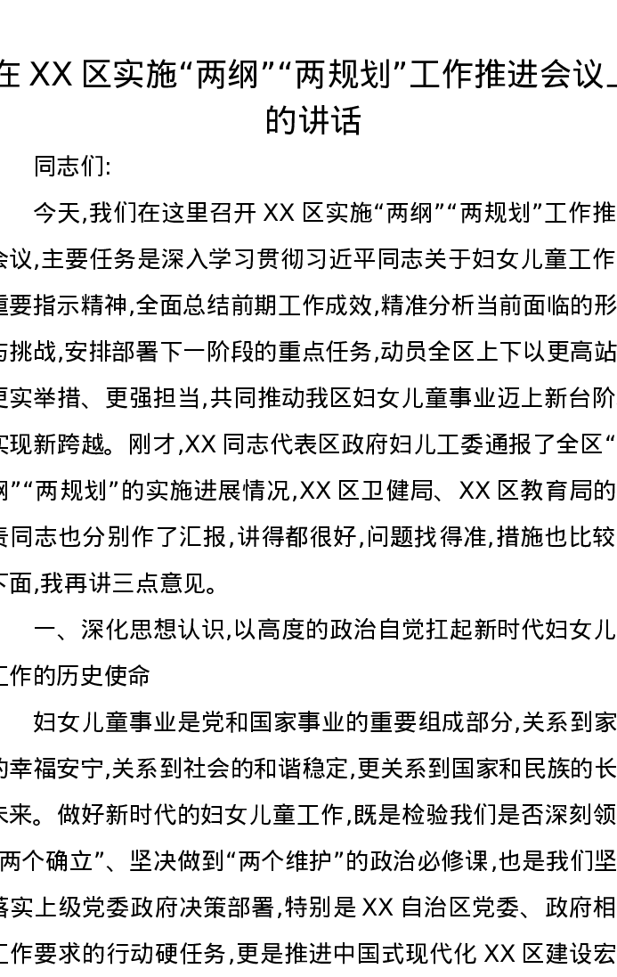 在XX区实施“两纲”“两规划”工作推进会议上的讲话