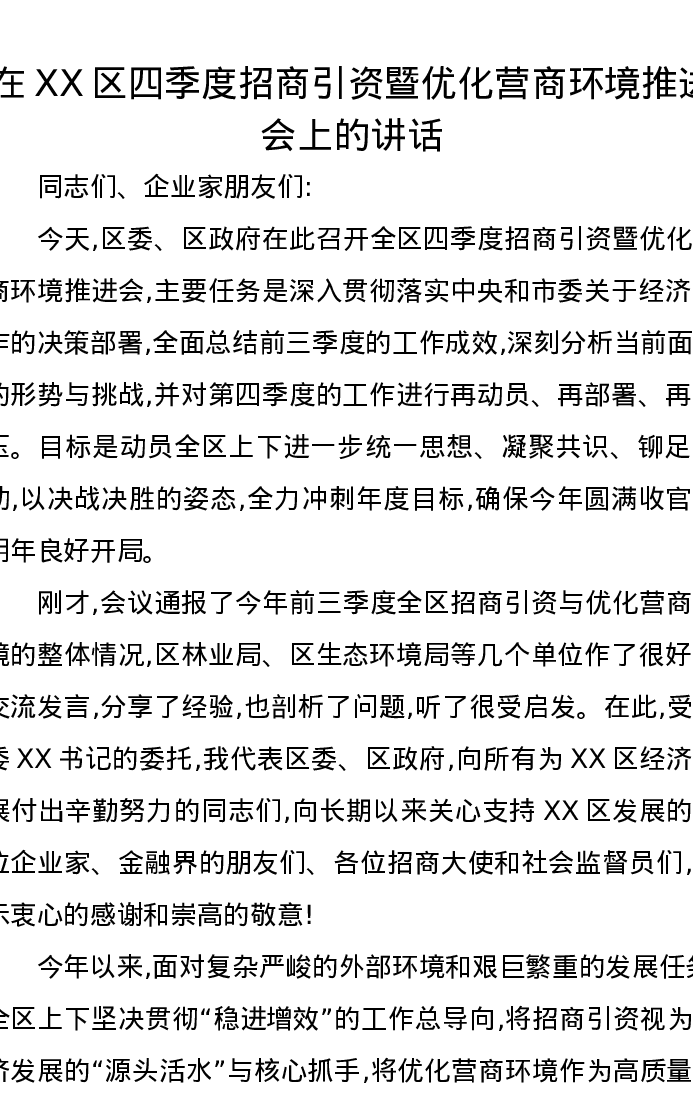 在XX区四季度招商引资暨优化营商环境推进会上的讲话