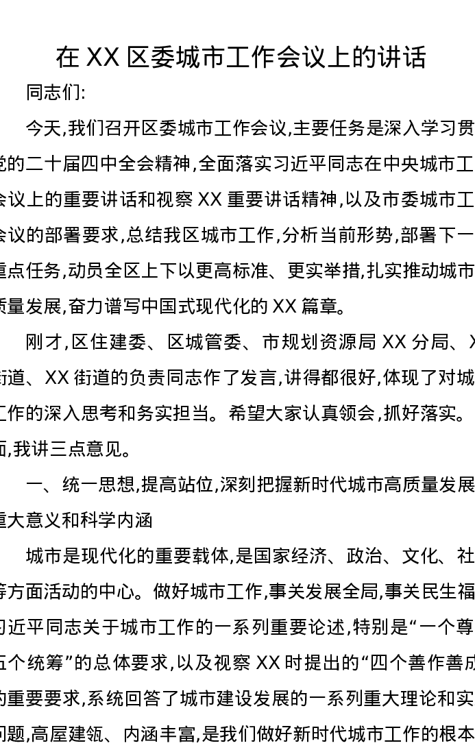 在XX区委城市工作会议上的讲话