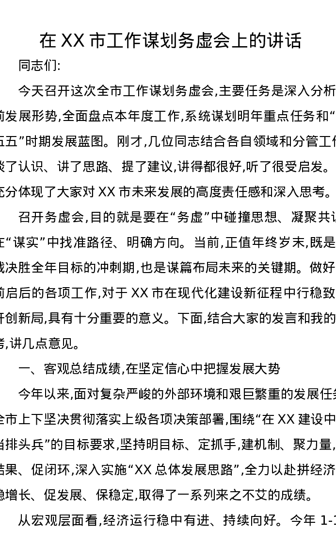 在XX市工作谋划务虚会上的讲话