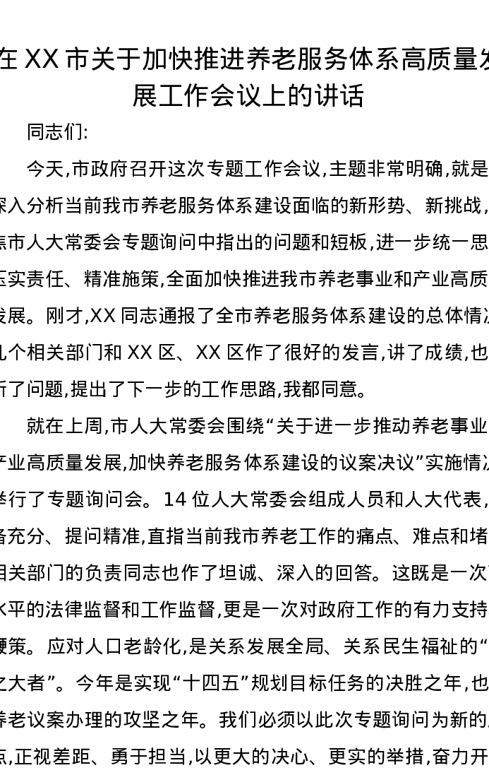 在XX市关于加快推进养老服务体系高质量发展工作会议上的讲话