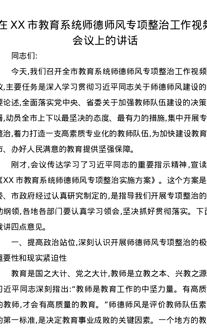 在XX市教育系统师德师风专项整治工作视频会议上的讲话