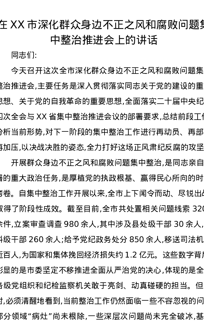 在XX市深化群众身边不正之风和腐败问题集中整治推进会上的讲话