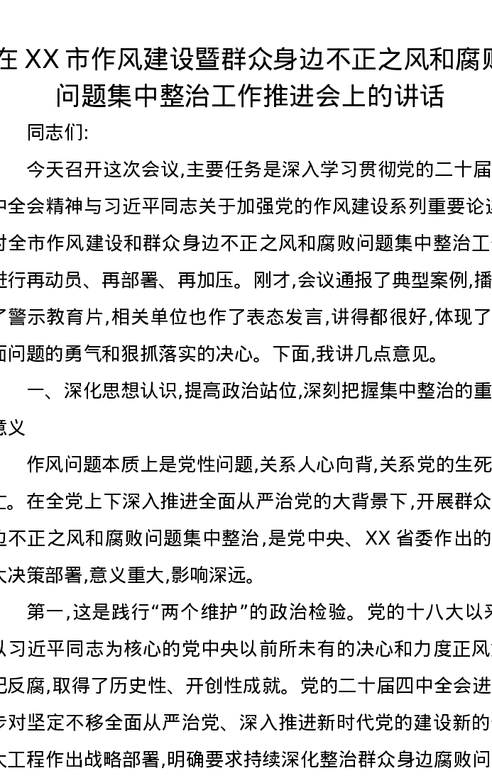 在XX市作风建设暨群众身边不正之风和腐败问题集中整治工作推进会上的讲话