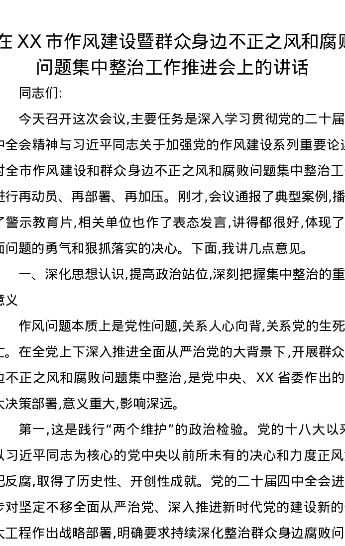 在XX市作风建设暨群众身边不正之风和腐败问题集中整治工作推进会上的讲话2