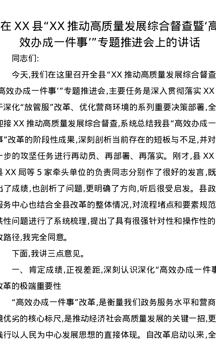 在XX县“XX推动高质量发展综合督查暨‘高效办成一件事’”专题推进会上的讲话