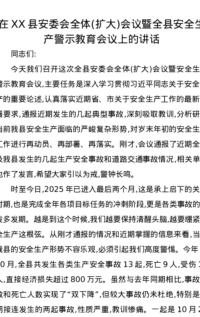 在XX县安委会全体(扩大)会议暨全县安全生产警示教育会议上的讲话