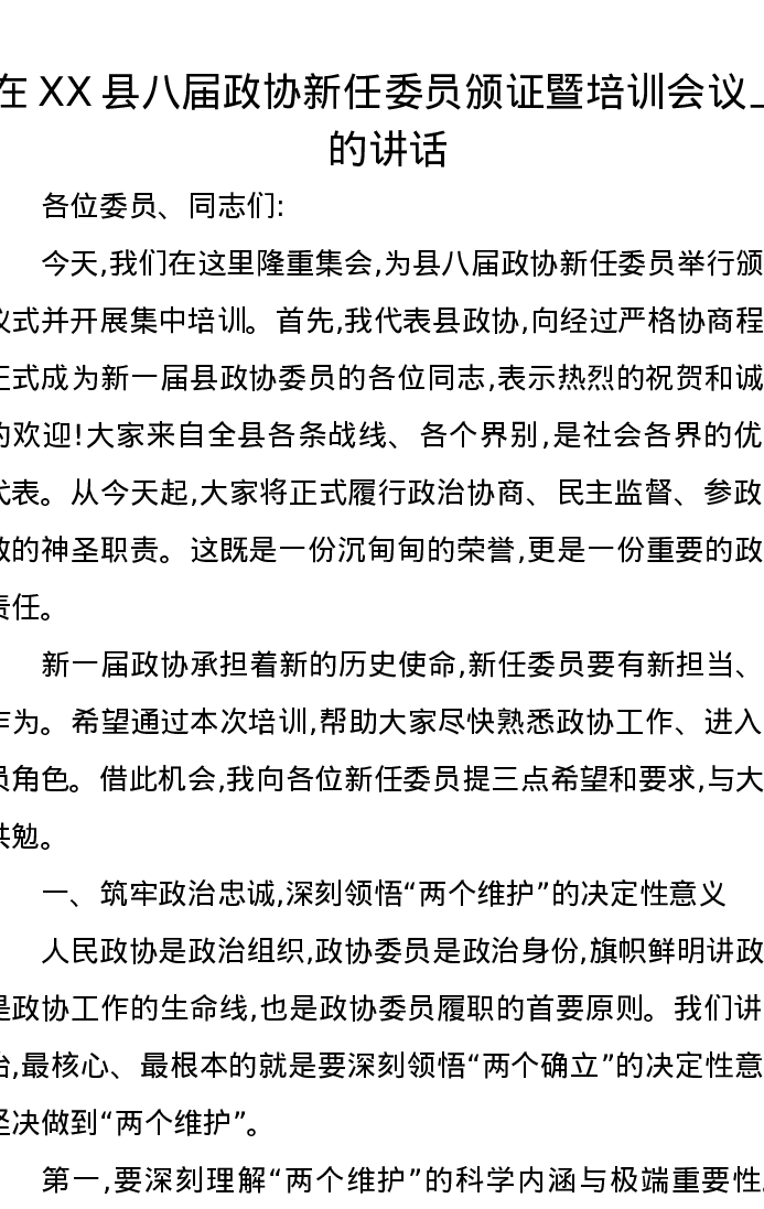 在XX县八届政协新任委员颁证暨培训会议上的讲话