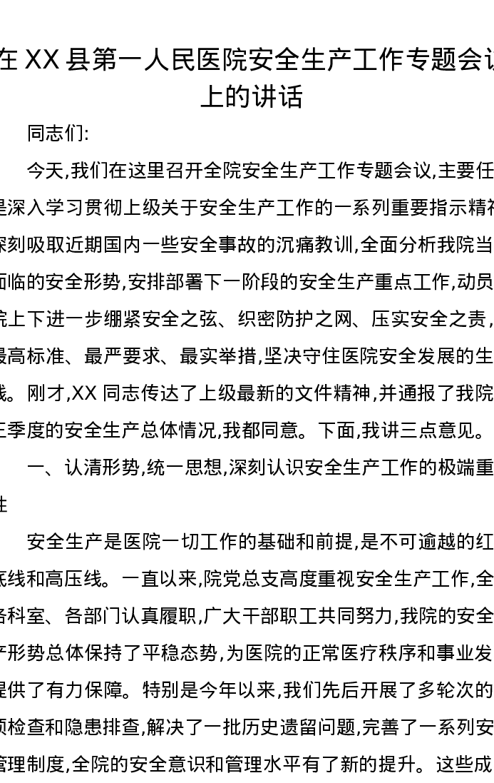 在XX县第一人民医院安全生产工作专题会议上的讲话