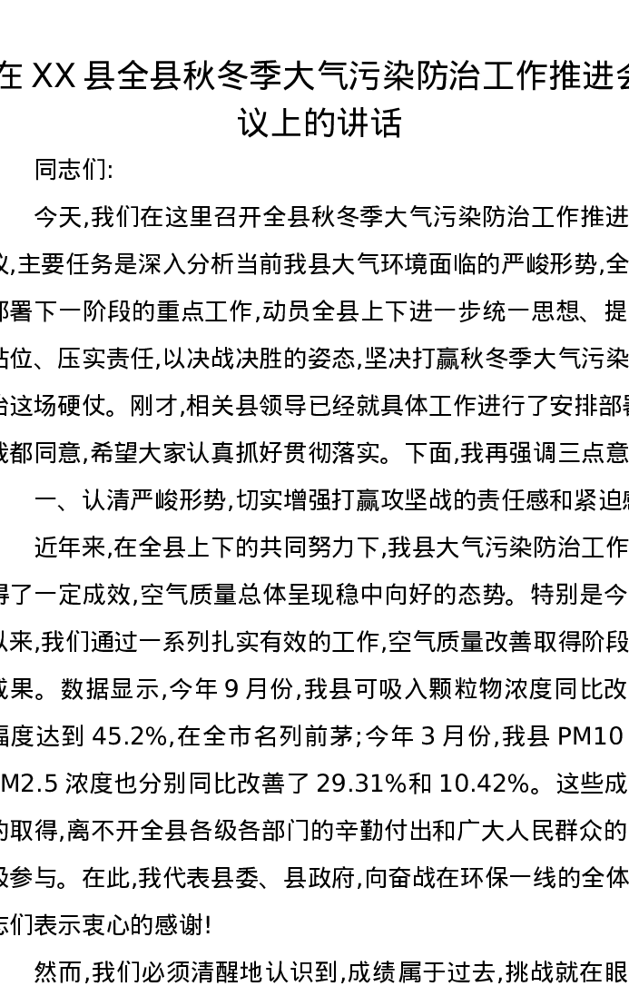 在XX县全县秋冬季大气污染防治工作推进会议上的讲话