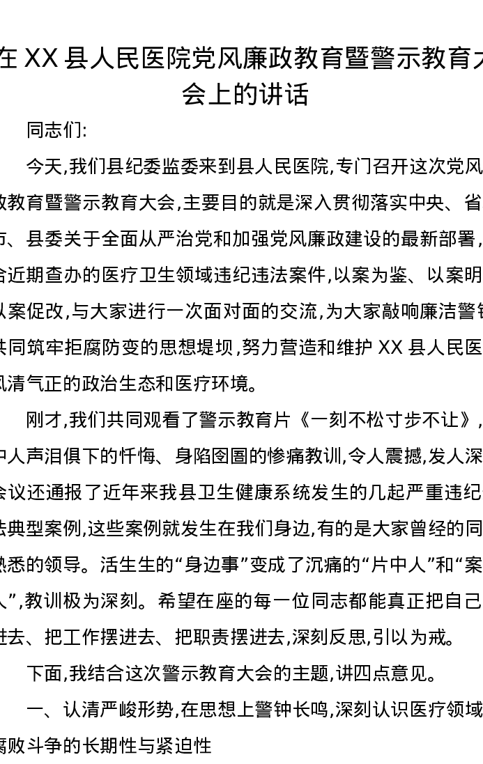 在XX县人民医院党风廉政教育暨警示教育大会上的讲话