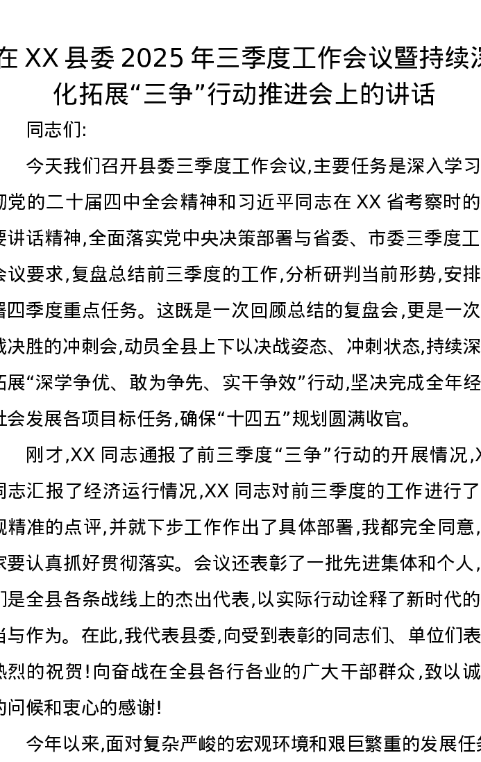 在XX县委2025年三季度工作会议暨持续深化拓展“三争”行动推进会上的讲话