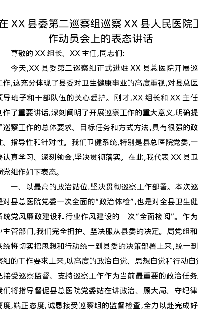 在XX县委第二巡察组巡察XX县人民医院工作动员会上的表态讲话