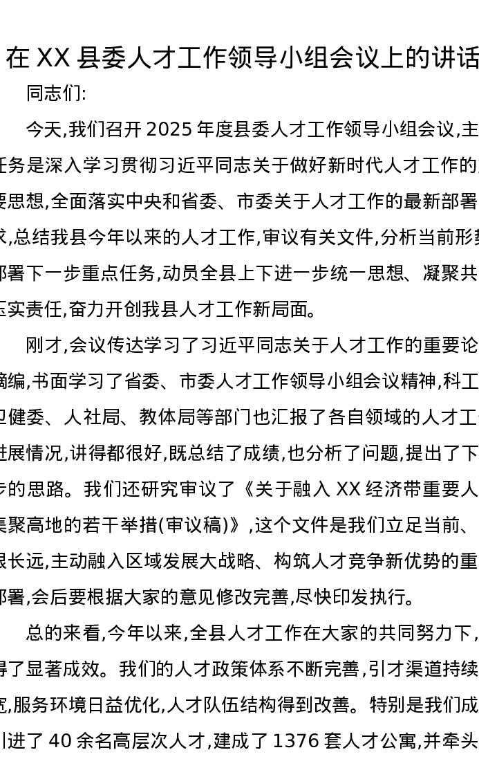 在XX县委人才工作领导小组会议上的讲话
