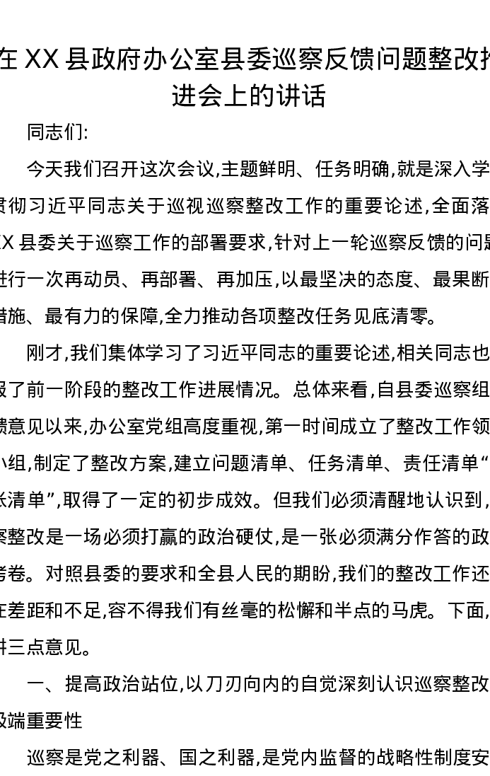 在XX县政府办公室县委巡察反馈问题整改推进会上的讲话