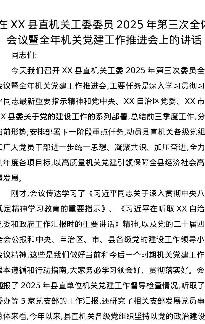 在XX县直机关工委委员2025年第三次全体会议暨全年机关党建工作推进会上的讲话