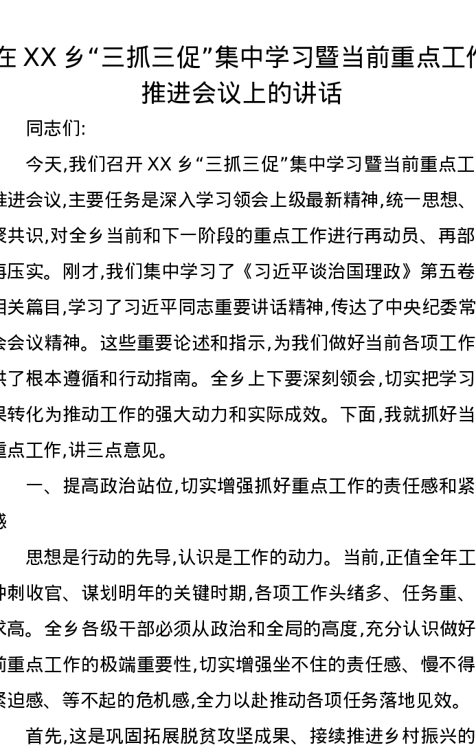 在XX乡“三抓三促”集中学习暨当前重点工作推进会议上的讲话