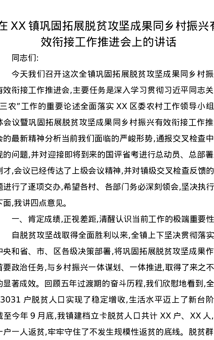 在XX镇巩固拓展脱贫攻坚成果同乡村振兴有效衔接工作推进会上的讲话