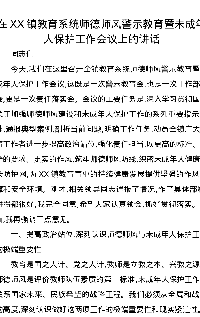 在XX镇教育系统师德师风警示教育暨未成年人保护工作会议上的讲话