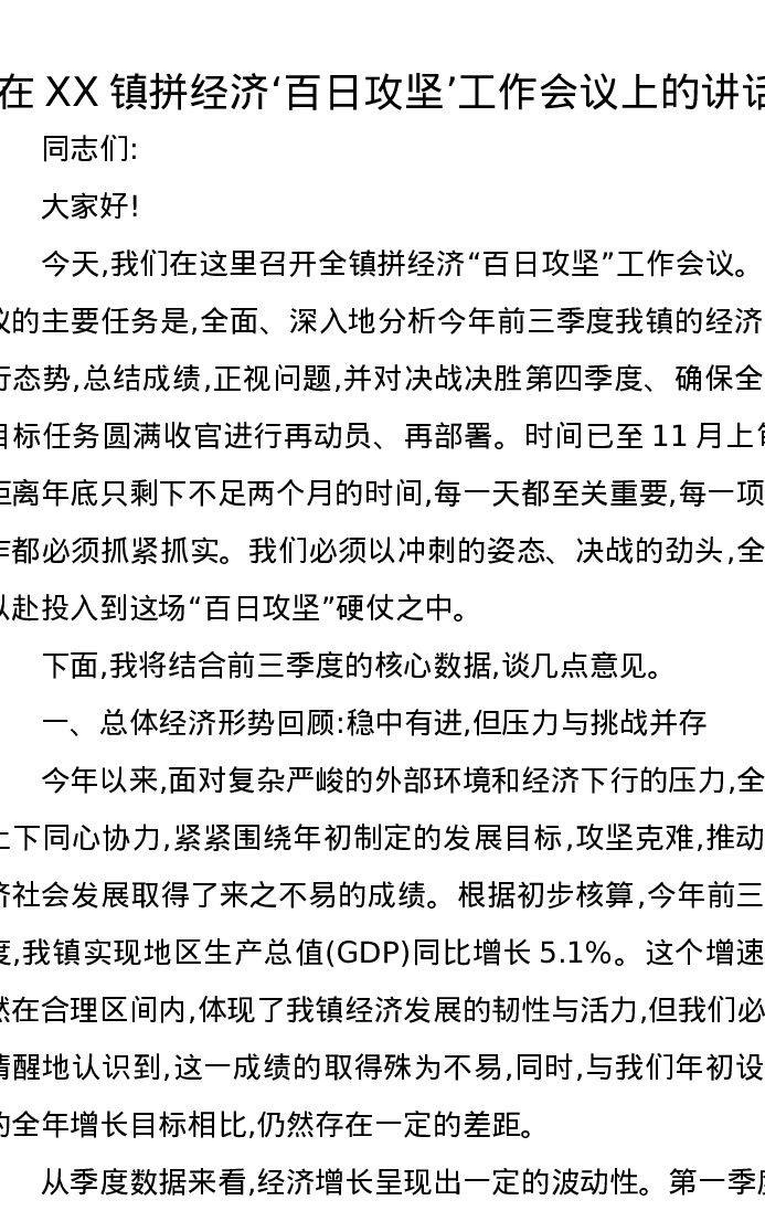在XX镇拼经济‘百日攻坚’工作会议上的讲话