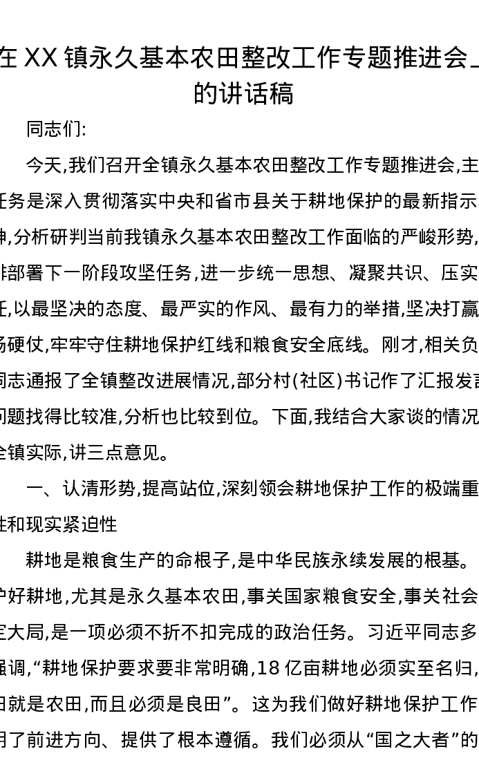 在XX镇永久基本农田整改工作专题推进会上的讲话稿