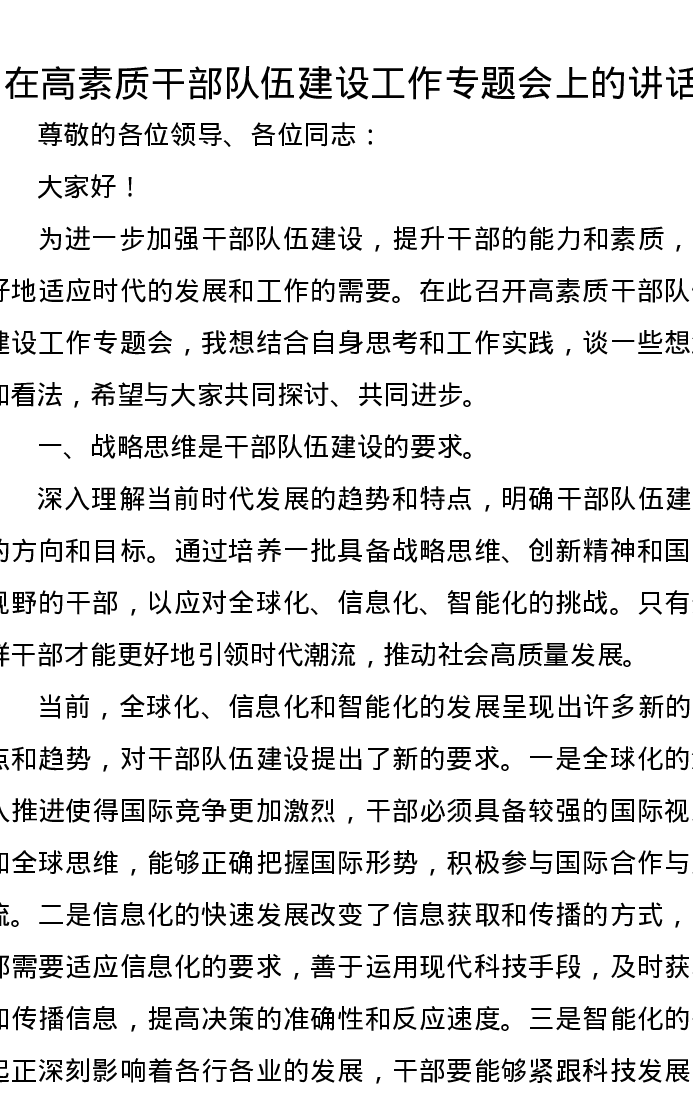 在高素质干部队伍建设工作专题会上的讲话