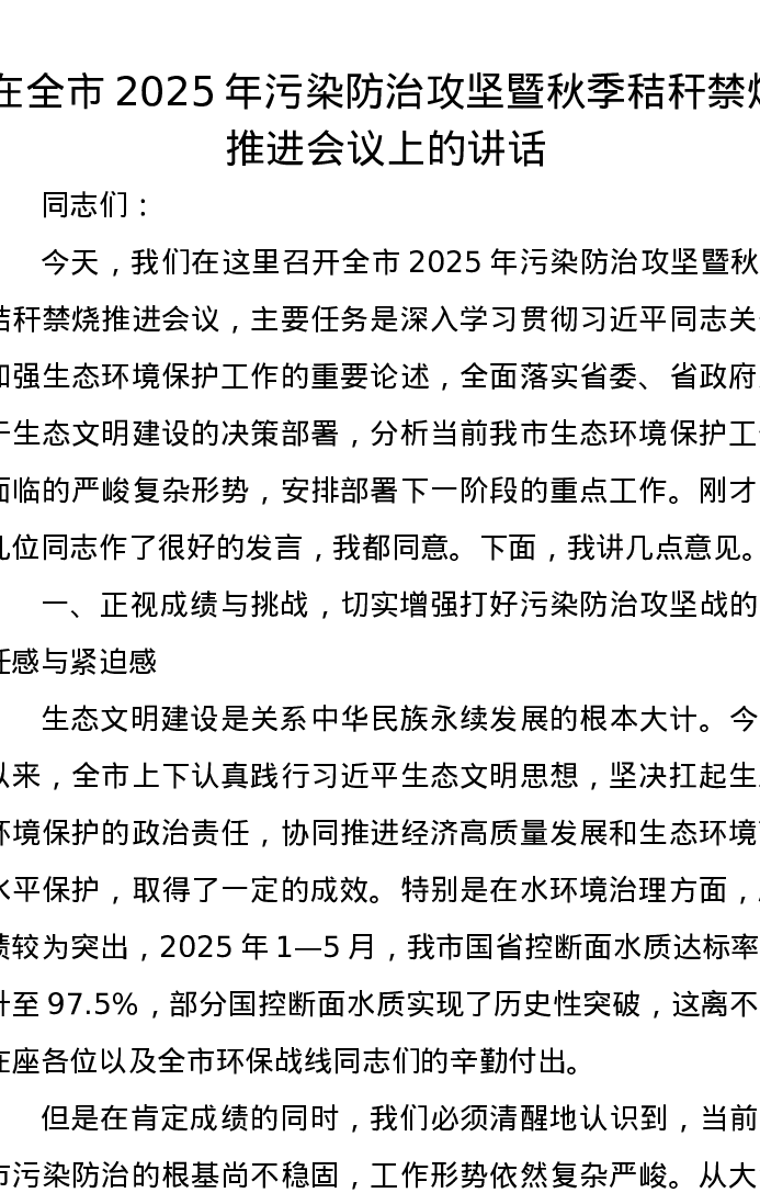 在全市2025年污染防治攻坚暨秋季秸秆禁烧推进会议上的讲话