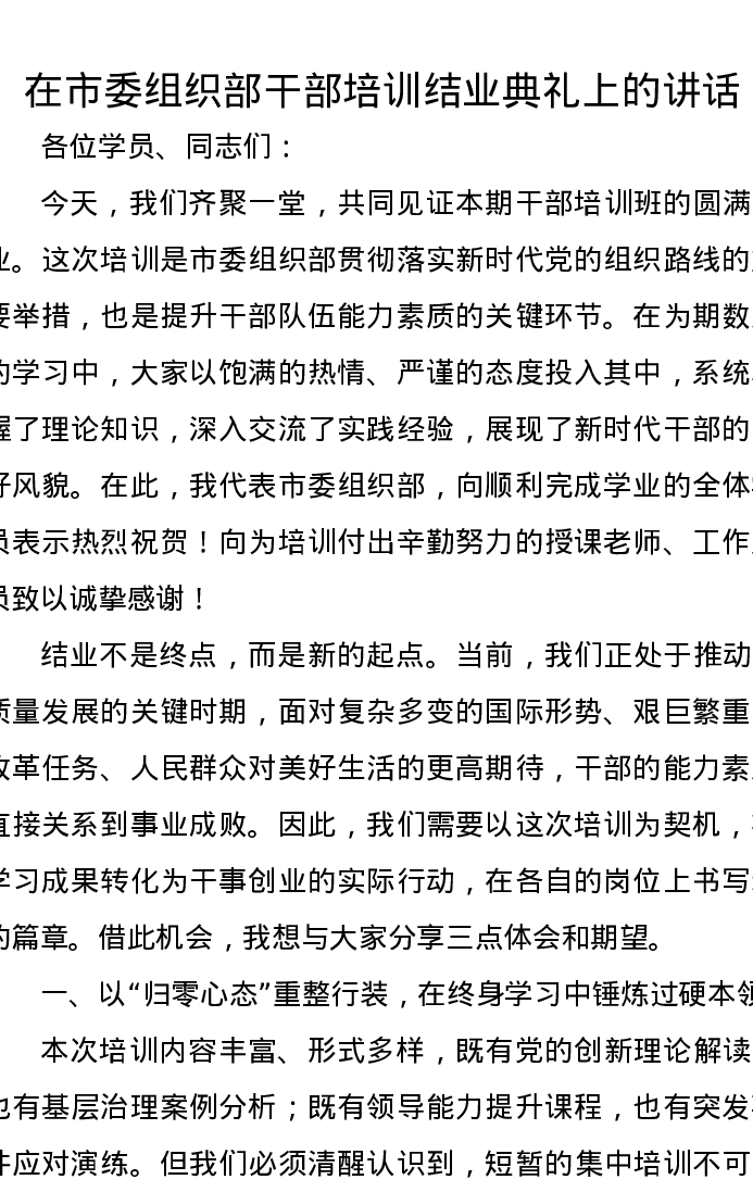 在市委组织部干部培训结业典礼上的讲话