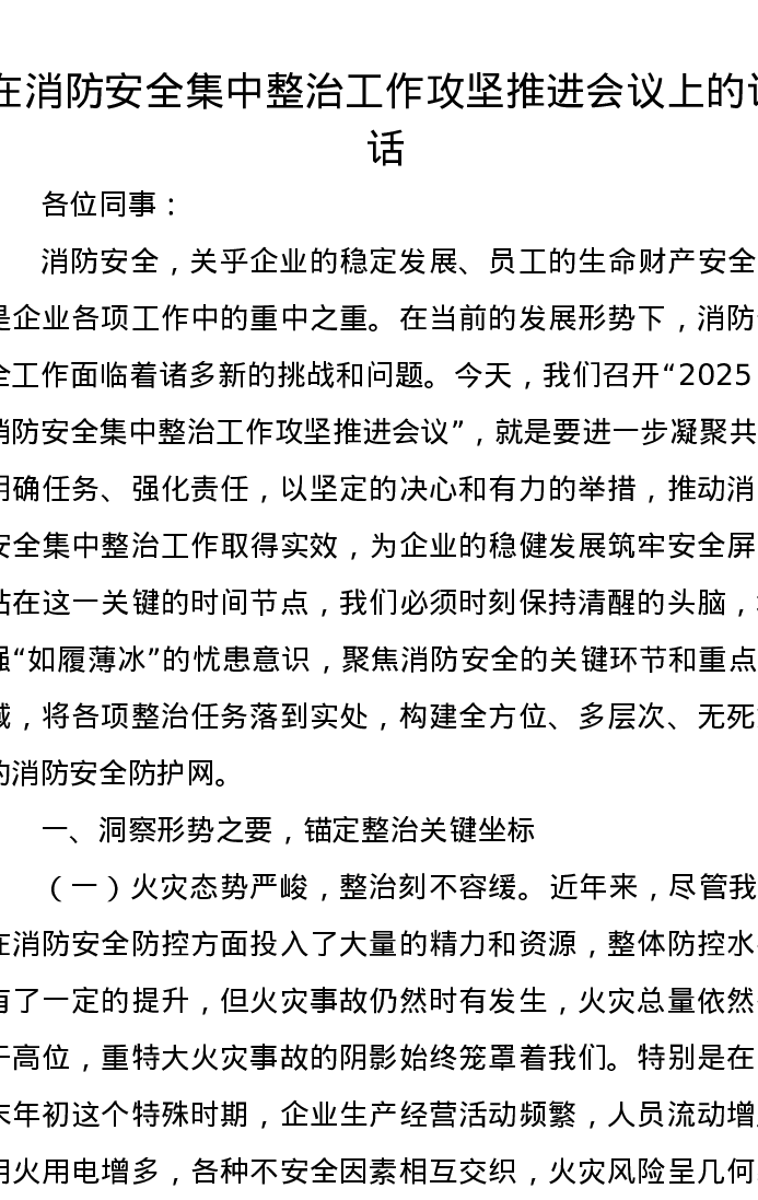 在消防安全集中整治工作攻坚推进会议上的讲话
