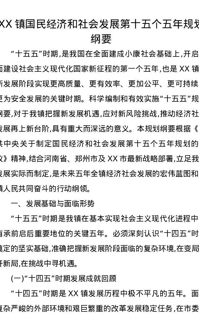 XX镇国民经济和社会发展第十五个五年规划纲要