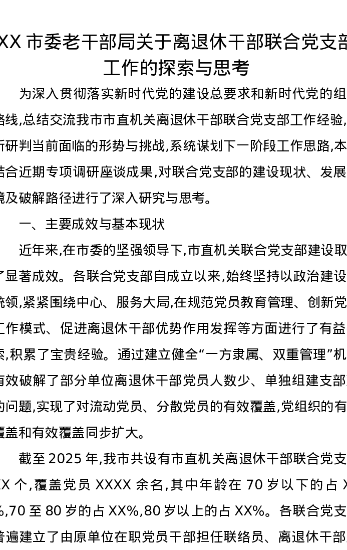 调研报告:XX市委老干部局关于离退休干部联合党支部工作的探索与思考