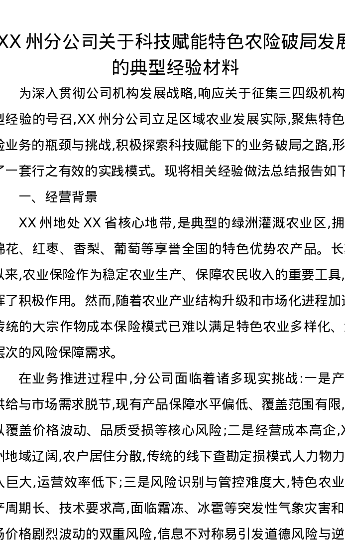 XX州分公司关于科技赋能特色农险破局发展的典型经验材料