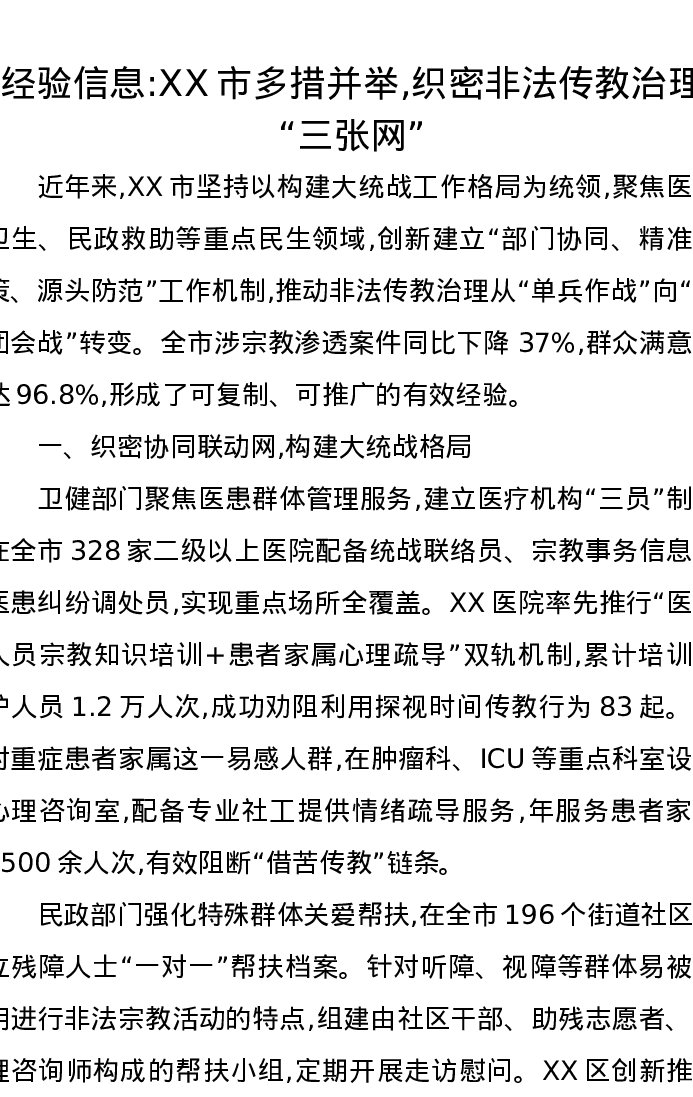 经验信息:XX市多措并举,织密非法传教治理“三张网”